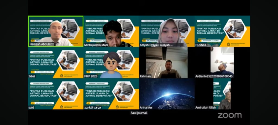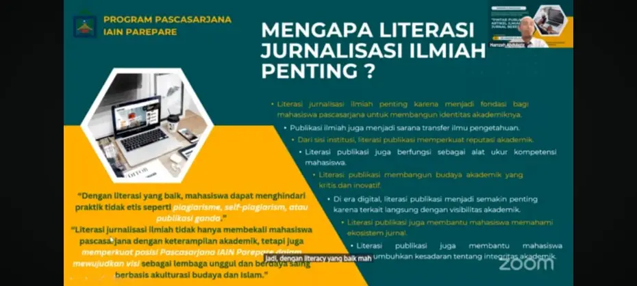 Kegiatan yang diselenggarakan dengan dukungan Forum Mahasiswa Pascasarjana (FMP) IAIN Parepare ini berlangsung aktif dan produktif. Berdasarkan pantauan layar Zoom, tampak antusiasme para peserta yang mengikuti jalannya acara. Slide utama kegiatan menampilkan desain bertema hijau dan kuning bertuliskan “Pintar Publikasi Artikel Ilmiah di Jurnal Bereputasi” dengan logo Program Pascasarjana IAIN Parepare, menggambarkan suasana akademik yang inspiratif dan penuh semangat literasi.