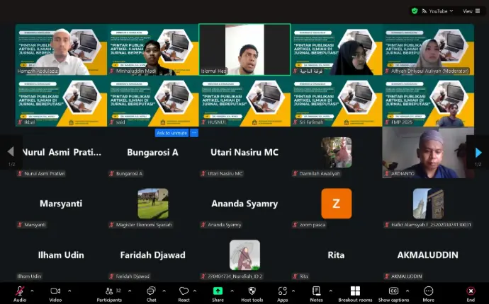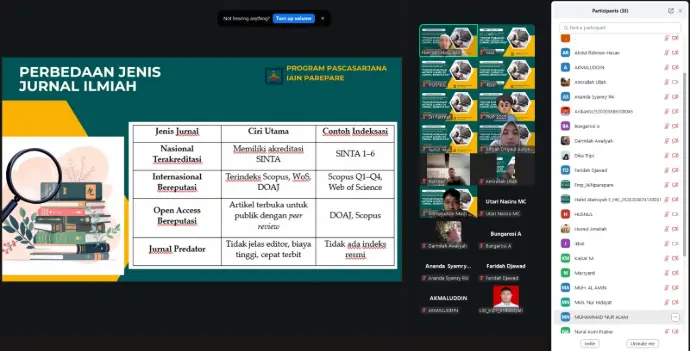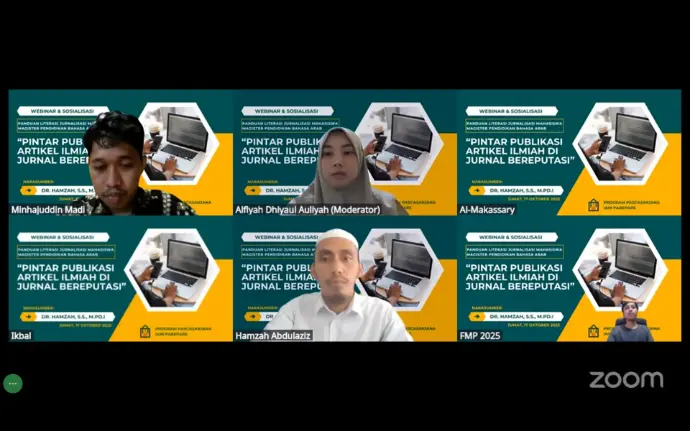 Parepare, 17 Oktober 2025 – Program Pascasarjana Institut Agama Islam Negeri (IAIN) Parepare menggelar webinar dan sosialisasi bertajuk "Pintar Publikasi Artikel Ilmiah di Jurnal Bereputasi" bagi mahasiswa Magister Pendidikan Bahasa Arab. Acara daring via Zoom ini diikuti 53 peserta dan berlangsung selama dua jam, mulai pukul 13.45 WITA hingga selesai.