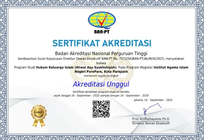 Sertifikat akreditasi resmi dari BAN-PT yang menunjukkan komitmen Pascasarjana dalam menjaga dan meningkatkan kualitas pendidikan tinggi. Program studi Hukum Keluarga Islam Pascasarjana IAIN Parepare telah melalui proses penilaian BAN-PT dan memperoleh status akreditasi sesuai standar nasional.