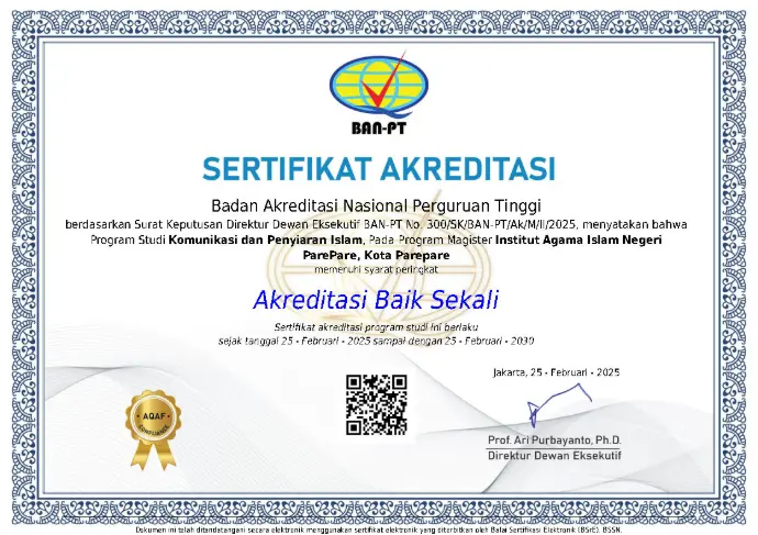 Sertifikat akreditasi resmi dari BAN-PT yang menunjukkan komitmen Pascasarjana dalam menjaga dan meningkatkan kualitas pendidikan tinggi. Program studi Komunikasi Penyiaran Islam Pascasarjana IAIN Parepare telah melalui proses penilaian BAN-PT dan memperoleh status akreditasi sesuai standar nasional.