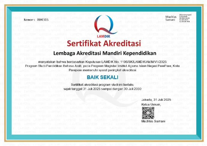 Sertifikat akreditasi resmi dari LAMDIK yang menunjukkan komitmen Pascasarjana dalam menjaga dan meningkatkan kualitas pendidikan tinggi. Program studi Pendidikan Agama Islam Pascasarjana IAIN Parepare telah melalui proses penilaian LAMDIK dan memperoleh status akreditasi sesuai standar nasional.
